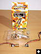 - le pointeur dont la transformation est décrite plus haut n'est plus disponible chez Conrad, mais il est possible que vous puissiez le trouver ailleurs sous une autre référence, par exemple dans cet emballage jaune marqué UL1(ci-contre : au premier plan deux circuits provenant de ce type de pointeur : la platine d'origine à gauche, la même équipée d'une diode laser 5 mW - réf. Conrad 0187 540 - à droite)