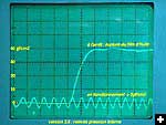 - R1 est réglée de façon à avoir 2,5 V au point A, le piston moteur étant au milieu de sa course entre le PMH et le PMB, le faisceau laser passant au centre du filtre orienté avec sa partie la plus foncée vers le haut. En fonction des composants utilisés et des possibilités de votre oscilloscope, vous pourrez éventuellement visualiser le signal directement au point A, sinon utilisez la sortie Vout. La résistance variable R1 n'apparaît pas sur les photos de gauche, elle était alors remplacée par une résistance fixe.